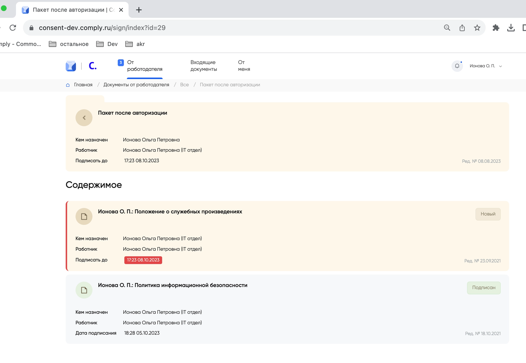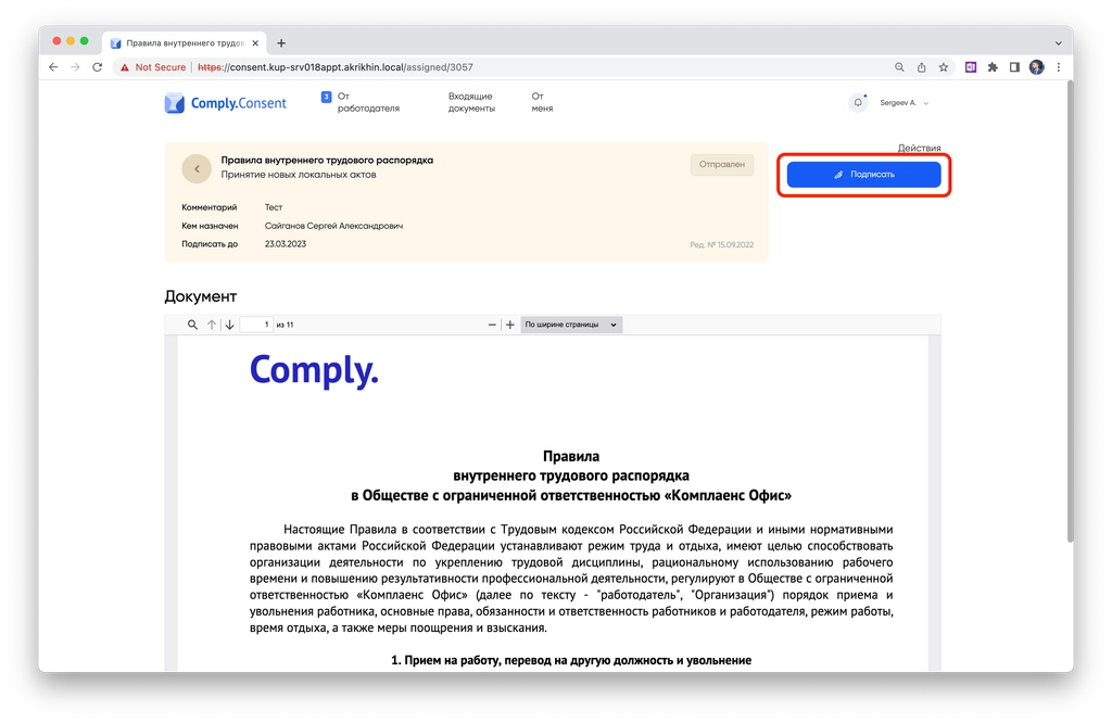 - Нажмите на документ, чтобы ознакомиться с его текстом. Вам откроется просмотр документа. В описательной части вы можете увидеть, кем вам назначен документ и крайний срок, до какого вам нужно подписать этот документ (на скрине в обеих строчках указан сам работник, но так отображается только для первого пакета входа. В других документах будет отображаться инициатор документа):