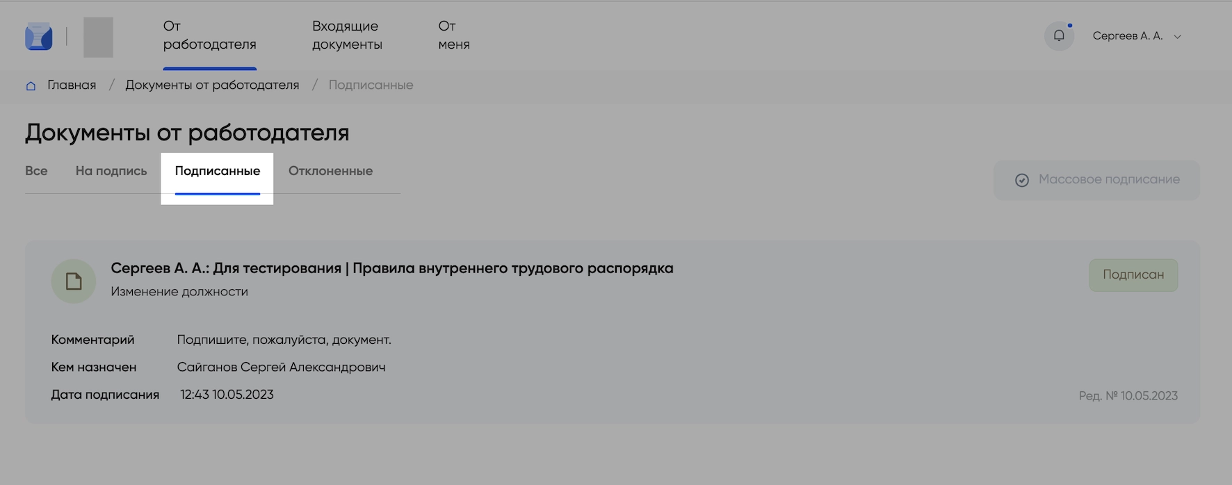 Подписанные», чтобы ознакомиться с подписанными вами документами