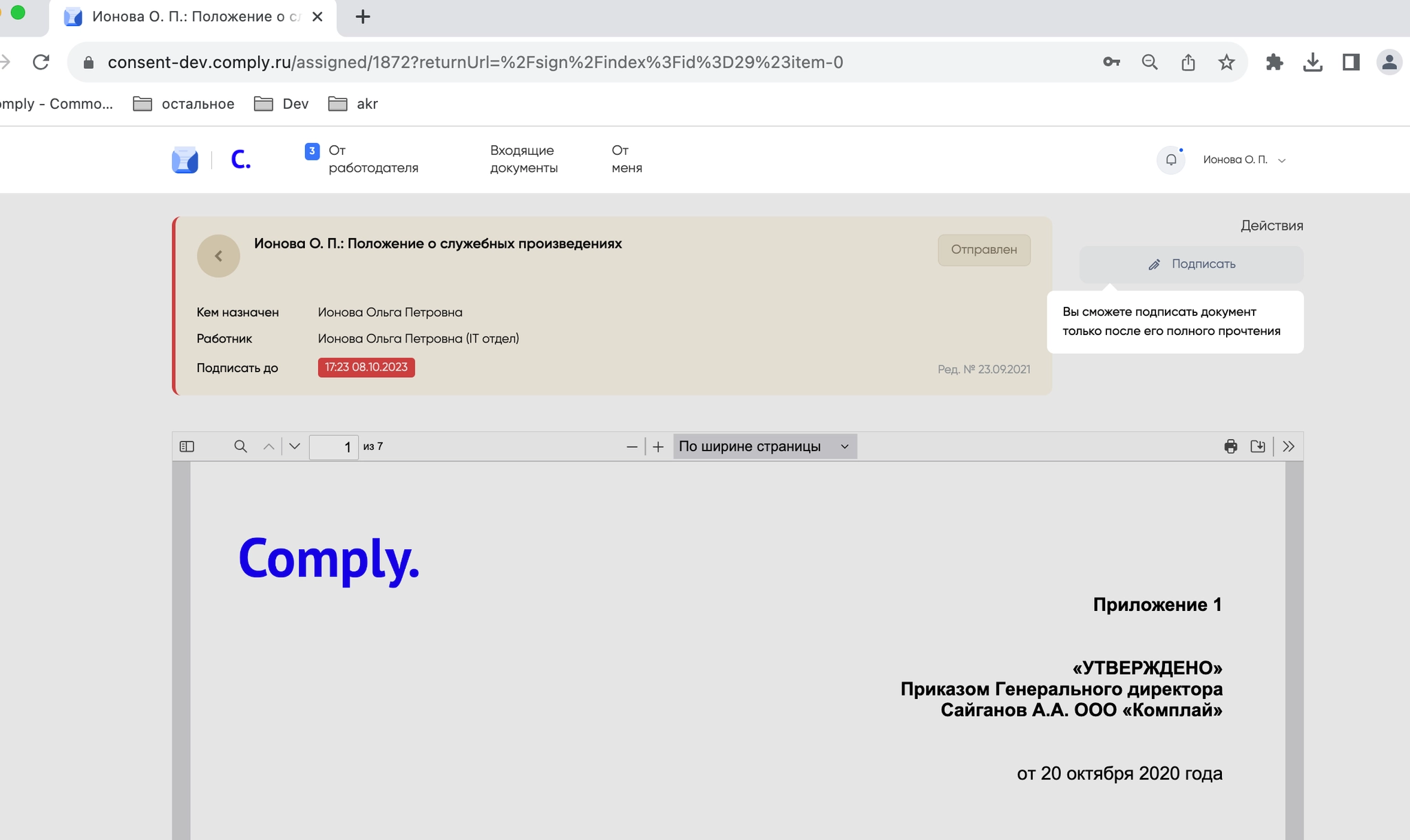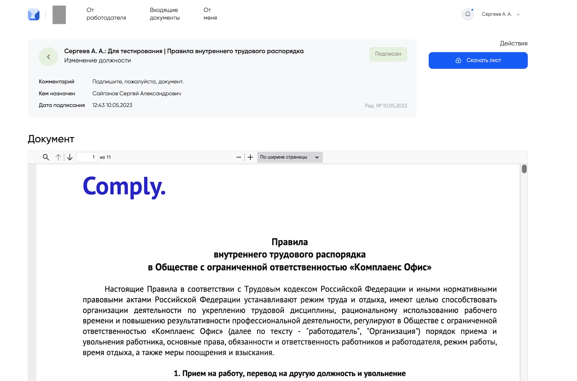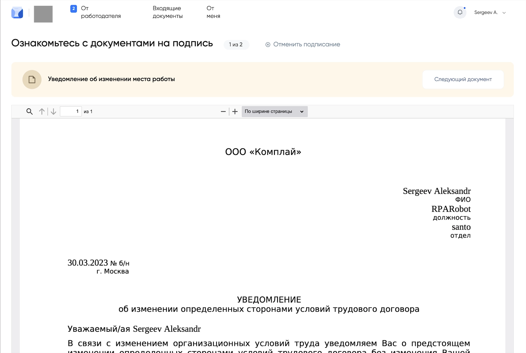- Все документы, направленные вам Отделом кадров/Отделом охраны труда/Отделом комплаенс/другим подразделением, будут приходить в папку «Документы от работодателя».