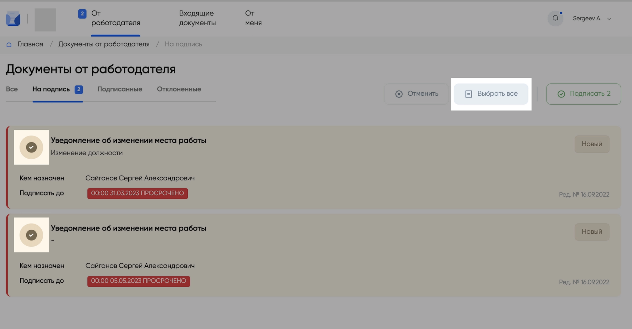 - Далее отметьте галочками документы, которые хотите подписать. Вы также можете нажать на кнопку «Выбрать все»