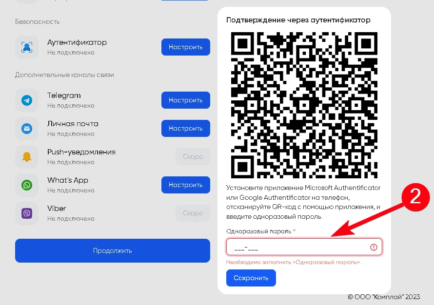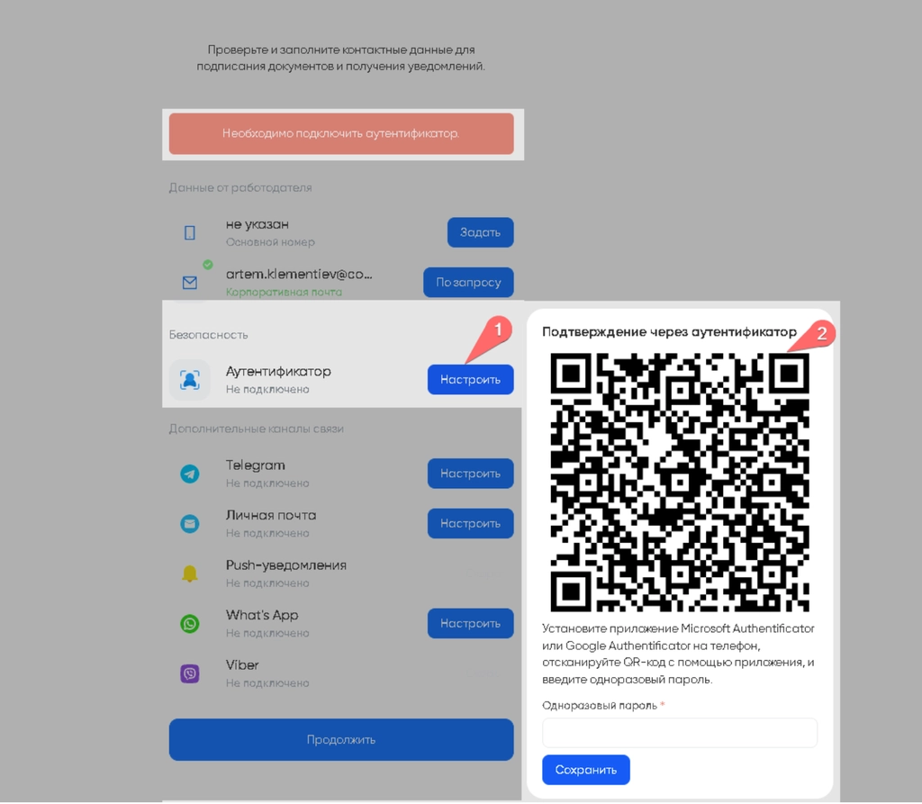 При первом входе, система также попросит вас подключить мобильный аутентификатор. При нажатии на кнопку “Настроить” в графе Аутентификатора откроется меню с QR-кодом, который необходимо отсканировать в мобильном приложении Microsoft Authenticator. Скачать мобильное приложение Microsoft Authenticator вы сможете с официального сайта - как для Android, так и для IOS.