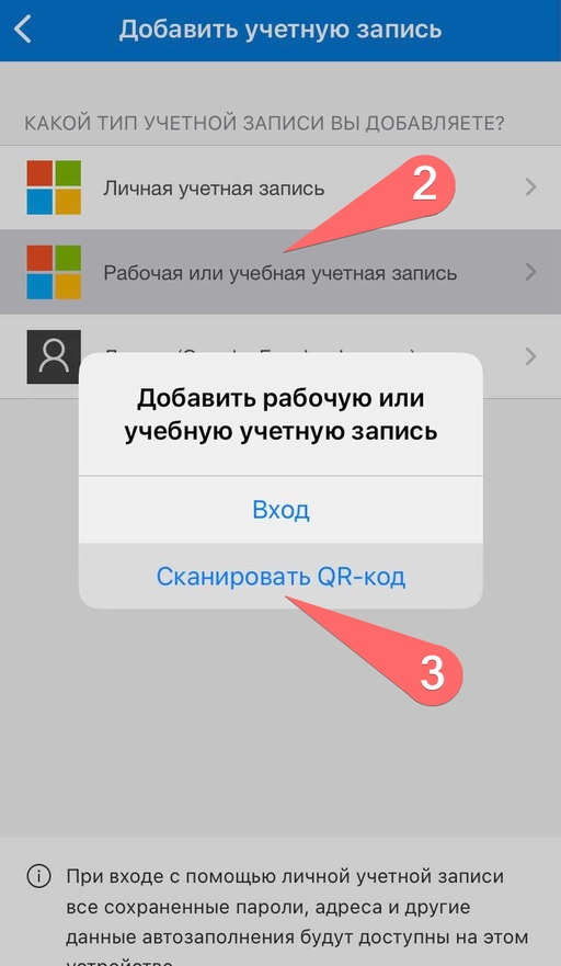 «Добавить учетную запись», после чего выбрать «Рабочая учетная запись» и отсканировать QR-код, который вы открыли ранее на странице входа.![]() |