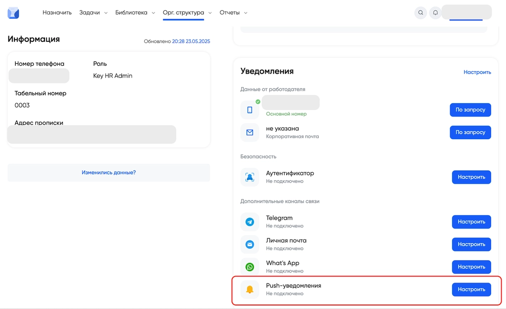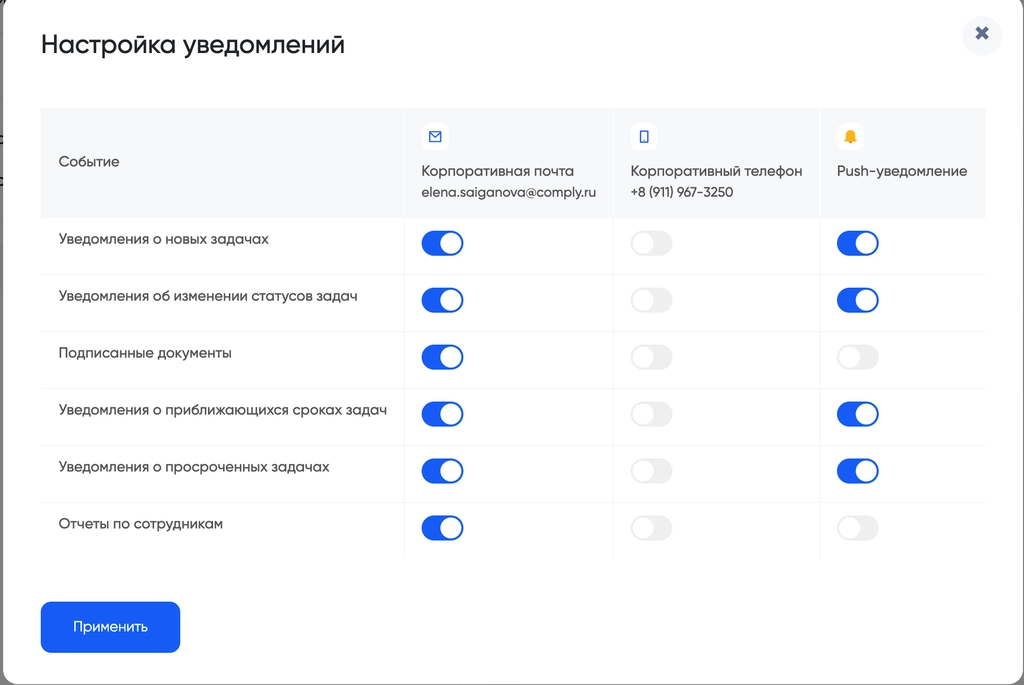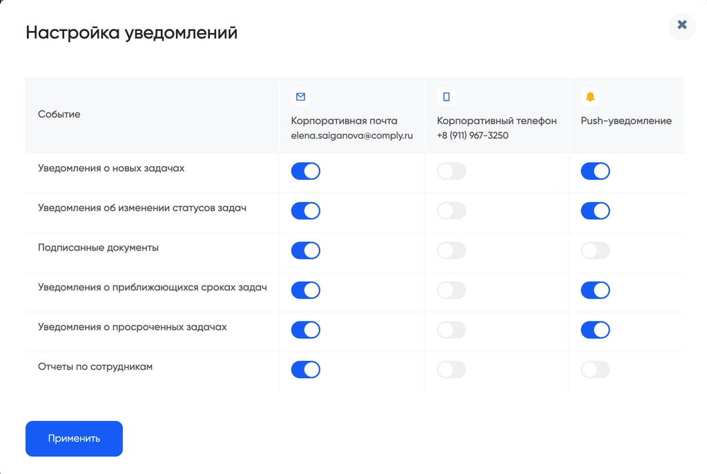 «Настроить» напротив нужного канала связи и следуйте подсказке.«Настроить» в правом верхнем углу этого блока Уведомления и в открывшемся окне активируйте переключатели в колонке Push-уведомление напротив тех видов событий, о которых вы хотите получать уведомления: